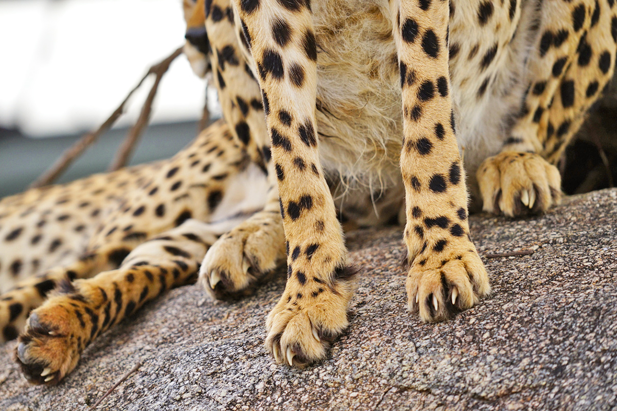 Cheetahs have semi-retractable claws that remain at least partially extended at all times, similar to those of dogs. Their claws are also somewhat blunt, providing better grip and traction, akin to an athlete’s cleats. This helps cheetahs achieve speeds of more than 70 mph. Their unique paw pads (which are hard like rubber) and long tails also aid in maneuverability while sprinting.