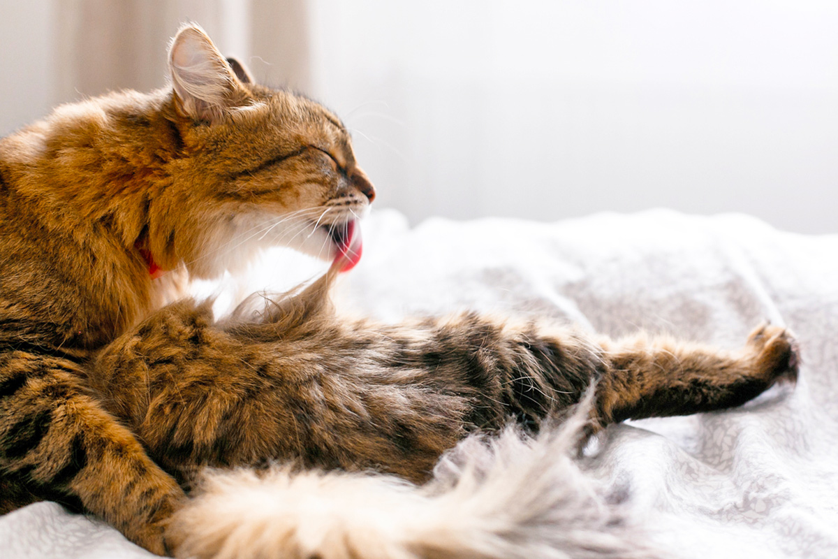 Grooming also plays a key role in cats’ social behaviors. They often groom each other in a bonding behavior known as “allogrooming,” which is observed in many mammalian species, including chimpanzees. You may even find your cat licking you — not just for attention, but as a sign of affection. As a bonus, grooming is soothing for cats, helping them self-regulate stress after experiences such as visits to the veterinarian or time away from their human companions.