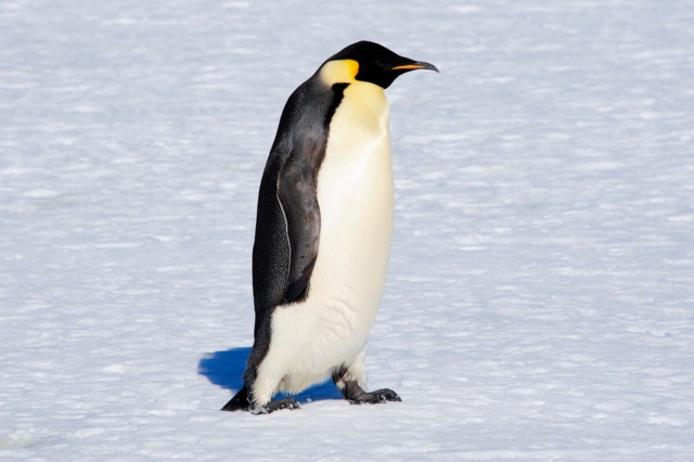 The emperor penguin is the heaviest of all the penguin species. Adults stand at around 43 to 47 inches tall and can weigh as much as 100 pounds, though weights vary greatly by sex and season. During the brutal Antarctic winters, emperor penguins need all the blubber they can muster to insulate themselves from the extreme cold, and they huddle together in tightly packed groups to keep warm.