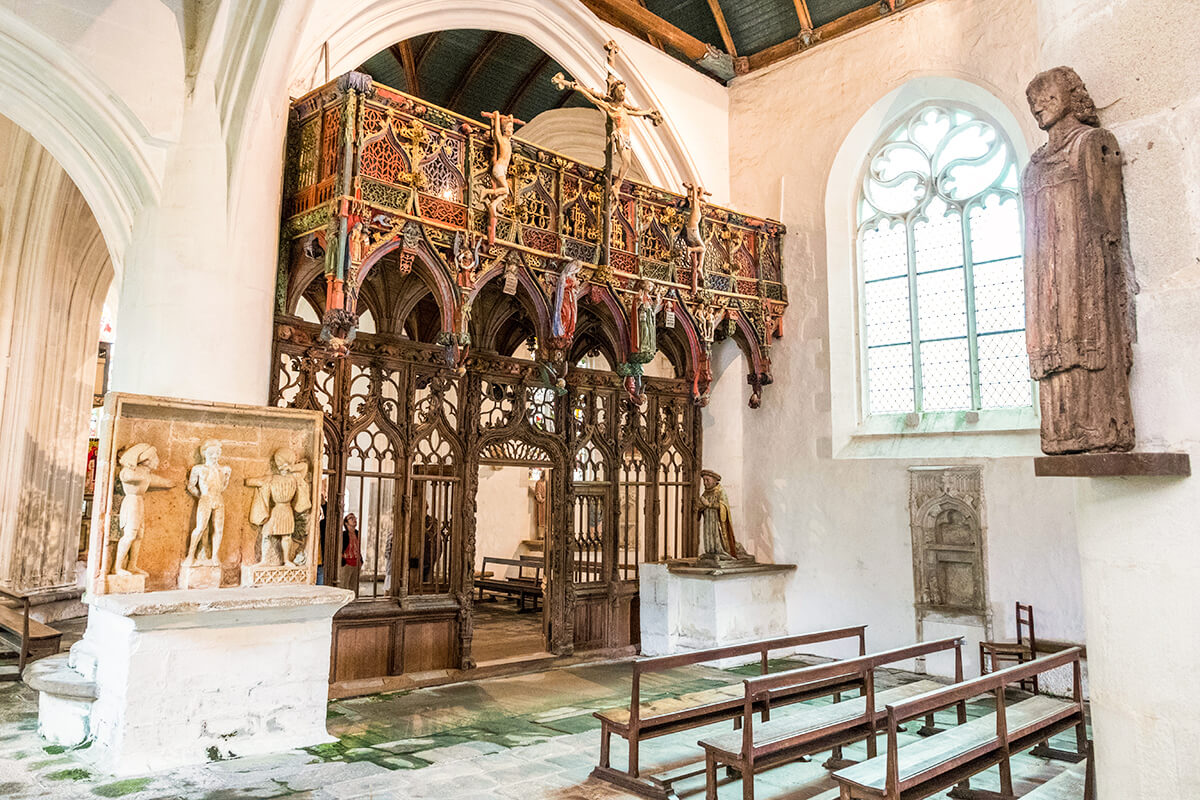 Red and green are also associated with Christianity due to rood screens, an architectural element found in many medieval churches. These wood-and-stone screens were often used to separate the area around the altar from the area where the congregation sits, and were traditionally painted red and green.